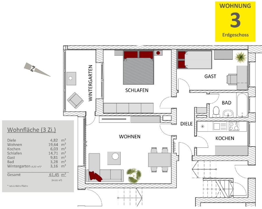 In Fotos oder Grundrissen dargestellte Einrichtungen, Möbel und dergleichen sind nicht Gegenstand des Verkaufs und dienen lediglich der Veranschaulichung oder als Einrichtungsbeispiel.