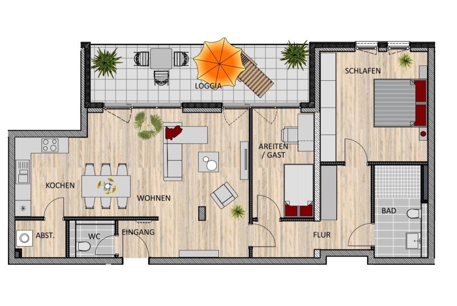 Die im Prospekt dargestellten Wohnflächenangaben können sich im Rahmen der Werkplanung und Ausführung geringfügig ändern. Die dargestellte Möblierung ist nicht Bestandteil dieses Angebotes. Sollte in einzelnen Wohnungen ein Kaminzug bzw. ein Kamin dargestellt sein, ist dieser ebenfalls nicht Bestandteil dieses Angebotes.